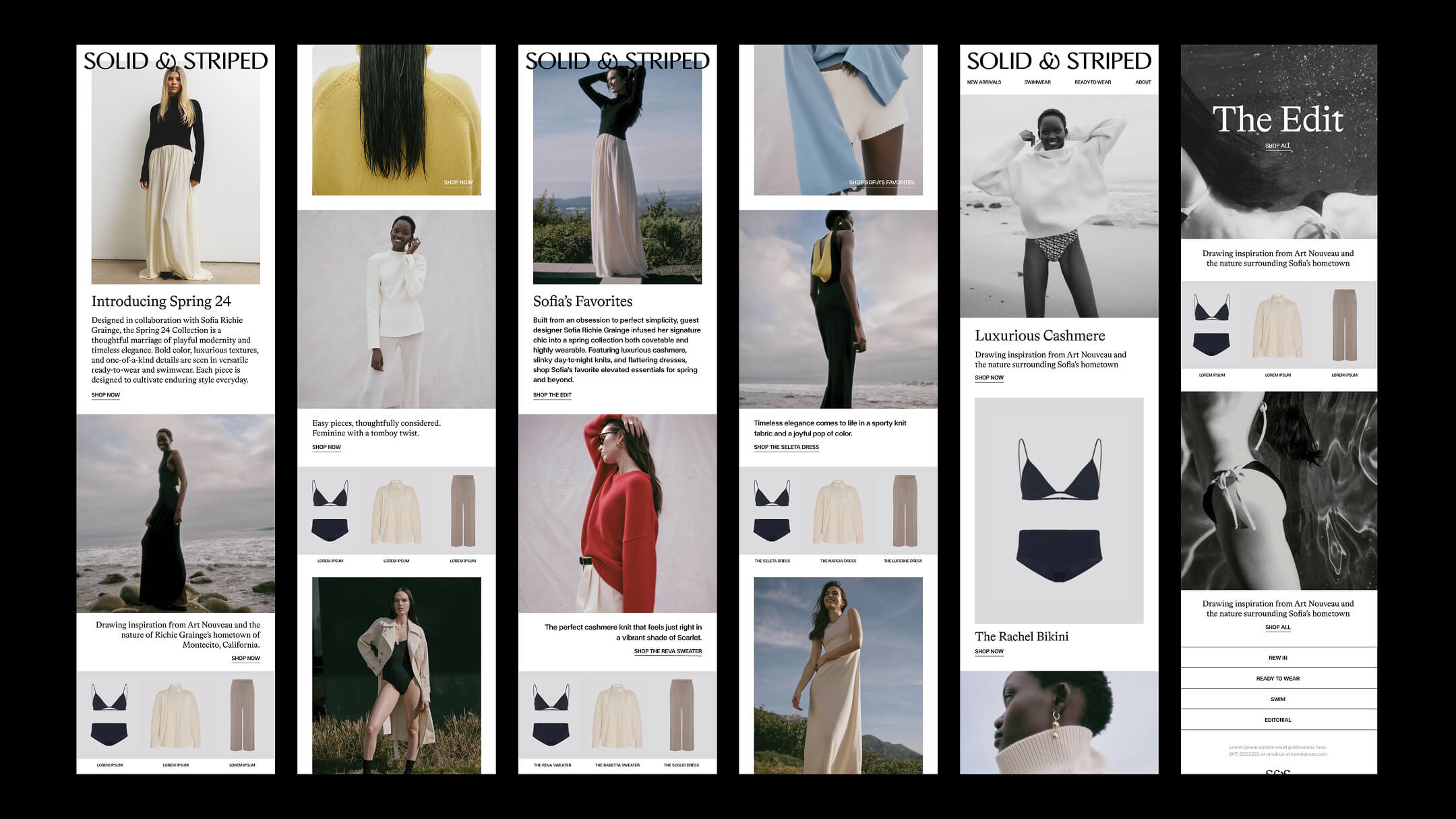 We led campaign concept and production, cross-channel content, digital and print design, packaging, and e-commerce design—overseeing execution across every consumer touchpoint. These efforts aligned brand, product, and marketing into a cohesive rebrand. The Spring 24 collection and collaboration with Sofia Richie Grainge served as the launchpad, introducing a new narrative and re-establishing Solid & Striped in the market with cultural relevance and commercial impact.